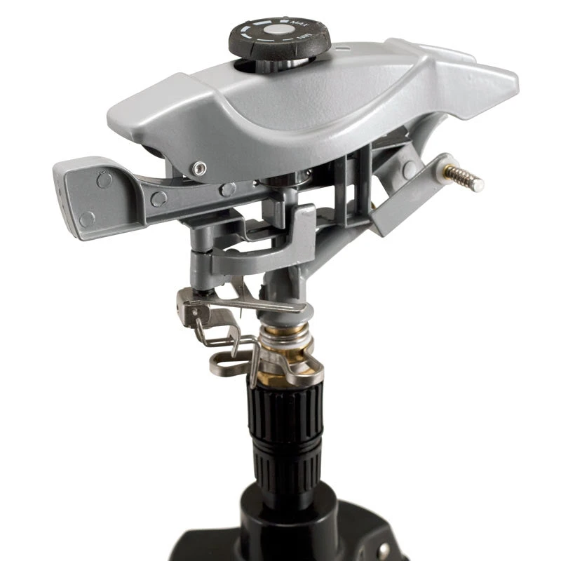 Adjustable heavy duty sprinkler on a riser enables watering a wide swath of yard space. Tripod footing made for stability.