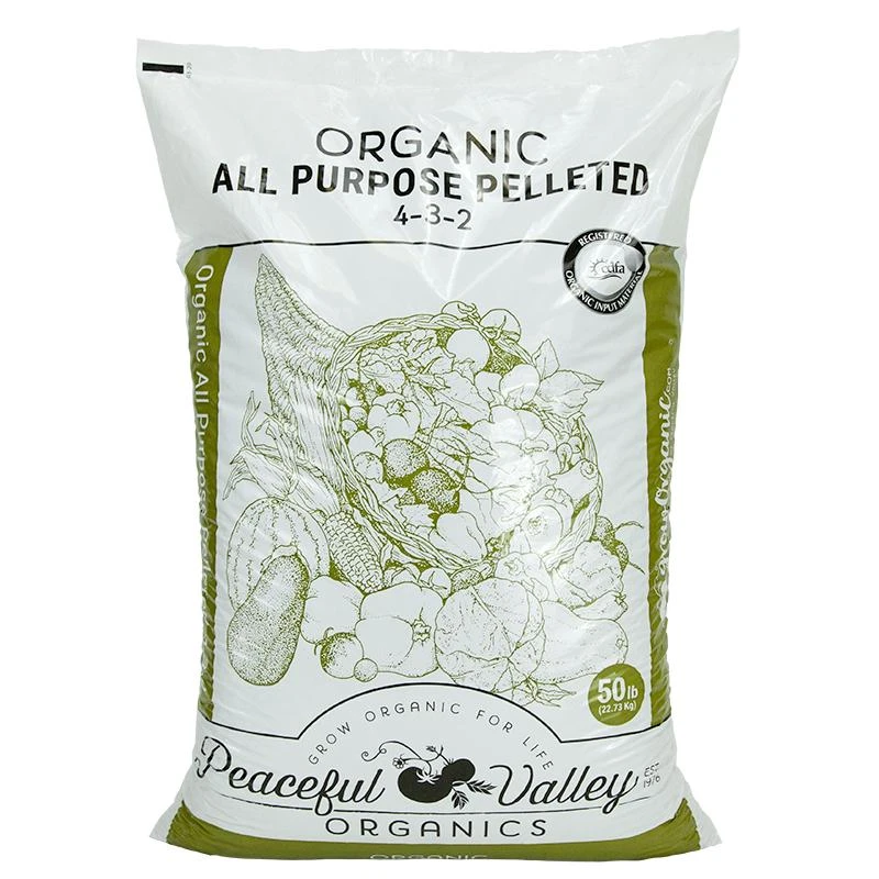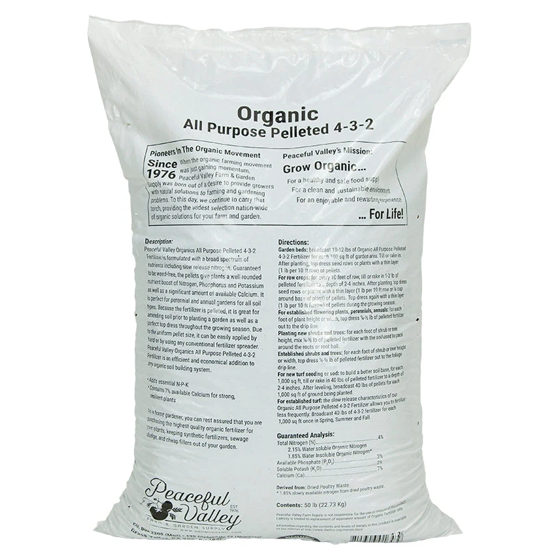 Peaceful Valley Organics All Purpose Pelleted Fertilizer is formulated with a broad spectrum of nutrients including slow release nitrogen. Guaranteed to be weed-free, the pellets give plants a well rounded nutrient boost of nitrogen, phosphorus and potassium as well as a significant amount of available Calcium. It is perfect for perennial and annual gardens for all soil types. Because the fertilizer is pelleted, it is great for amending soil prior to planting a garden as well as a perfect top dress throughout the growing season. Due to the uniform pellet size, it can be easily applied by hand or by using any conventional fertilizer spreader. Peaceful Valley Organics All Purpose Pelleted Fertilizer is an efficient and economical addition to any organic soil building system.
