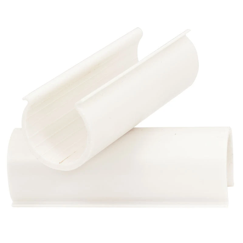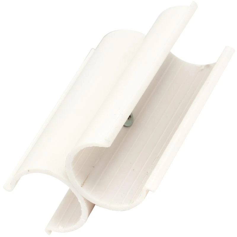 Two Rowcover Clamps attached to each other with a swivel. Clamp one side to your PVC rowcover hoops, and clamp the other side to your lengthwise PVC supports to keep the hoops stable and support the covering.